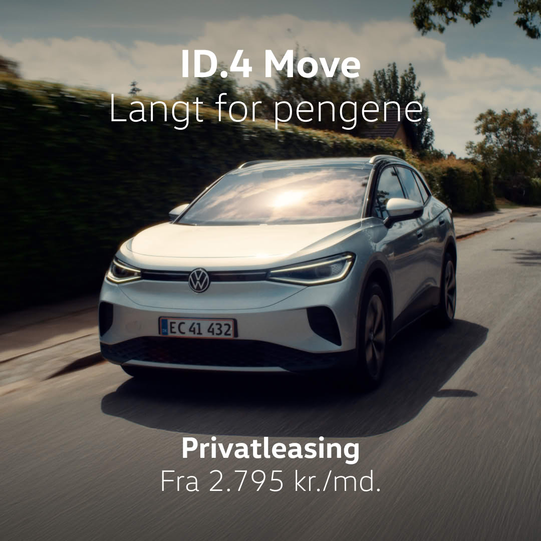 ID.4 Move. Forbrug: 16 kWh/100 km. Rækkevidde: 558 km. Halvårlig CO2-ejerafgift: 460 kr. Opladning: DC (10-80%): 28 min. AC (0-100%): 8 t. Vist m. Designpakke og Eksteriørpakke Silver. Privatleasing fra 2.795 kr./md. v. 10.000 km/år. Førstegangsydelse: 45.000 kr. Mindstepris i bindingsperiode (12 mdr.): 79.140 kr. Totaludgift v/48 mdr.: 179.760 kr. ekskl. halvårlig CO2-ejerafgift, forsikring, strøm. Læs mere på www.vwsf.dk/privatleasing. Inkl. Service- og Reparationsabn. Se vilkår på www.semler.dk/servicevilkår/privatleasing. Leasing udbydes af VWSF A/S. Gælder v. udlevering inden 30.06.2026.
